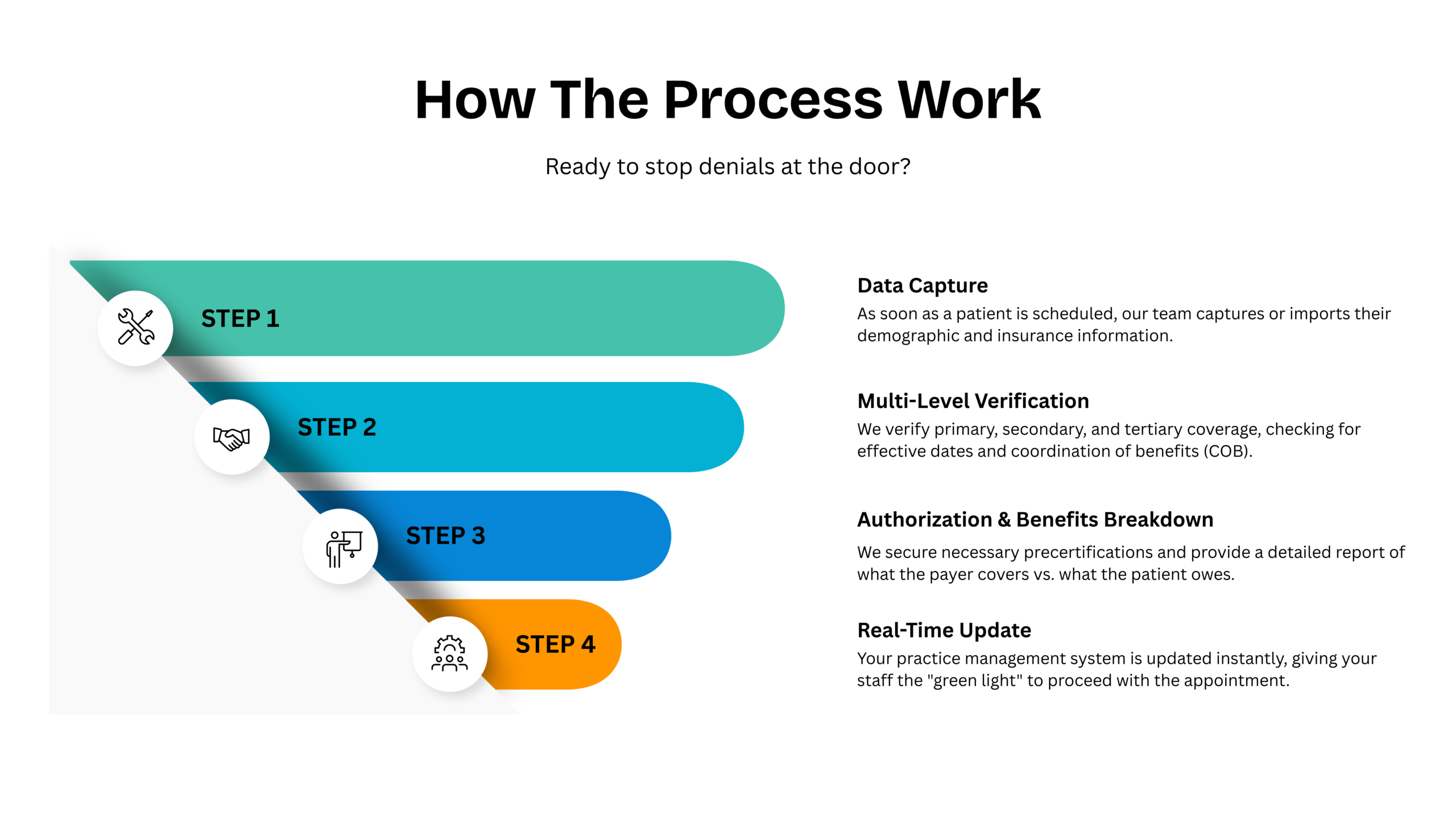 Free your staff from hour-long hold times with insurance companies; we handle the calls for you.