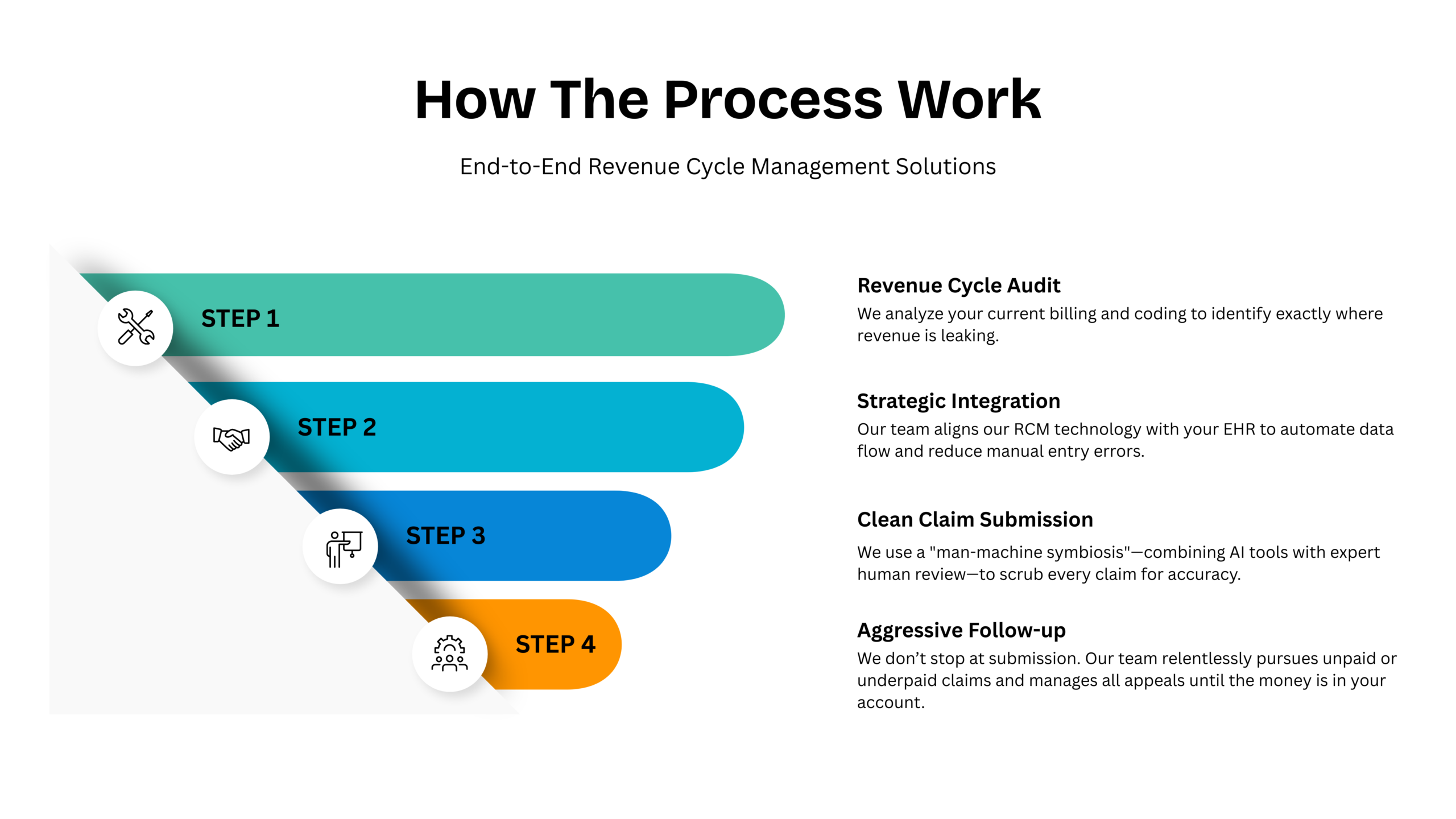 MedBill RCM Solutions offers a complete, 360-degree RCM service that manages your financial operations from patient registration to final payment collection. Our mission is to bridge the gap between providing care and getting paid. We optimize every touchpoint of your revenue cycle to ensure better financial outcomes, allowing you to focus on what matters most—your patients.